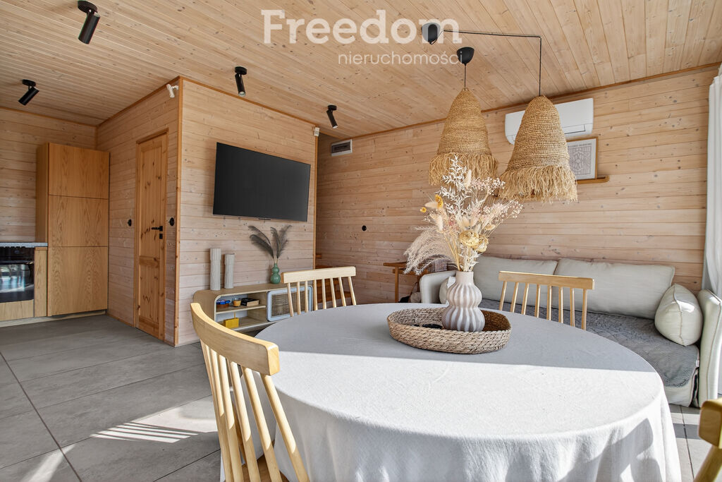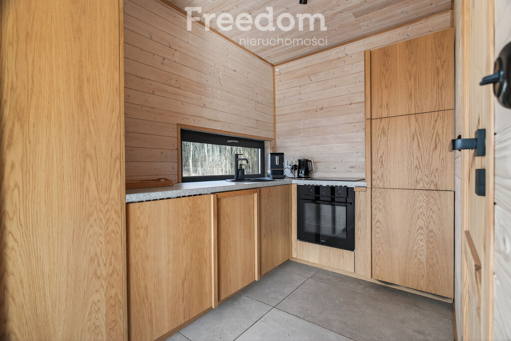 Domek drewniany, ładnie wykończony. W kuchni szafki fornirowane oraz